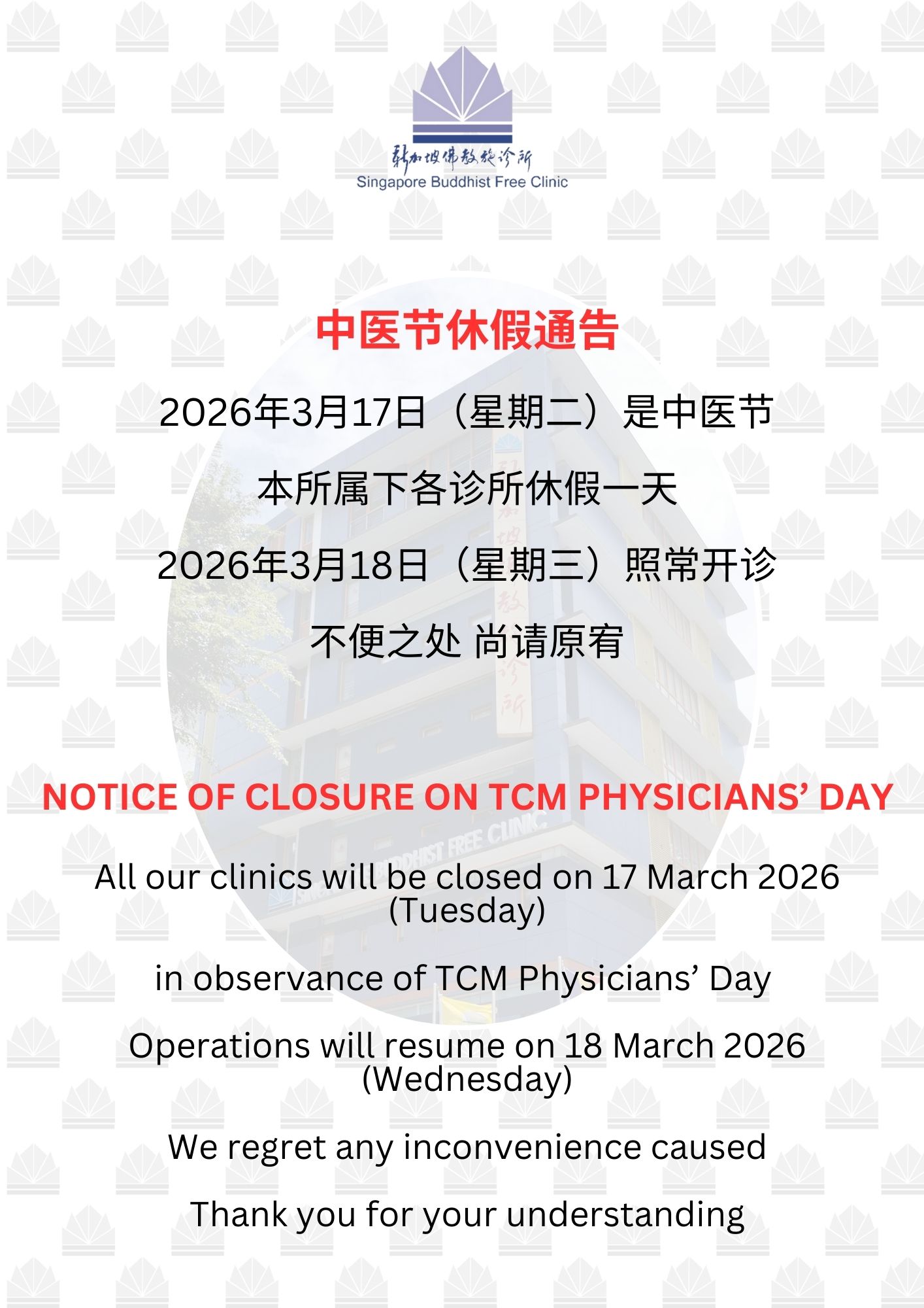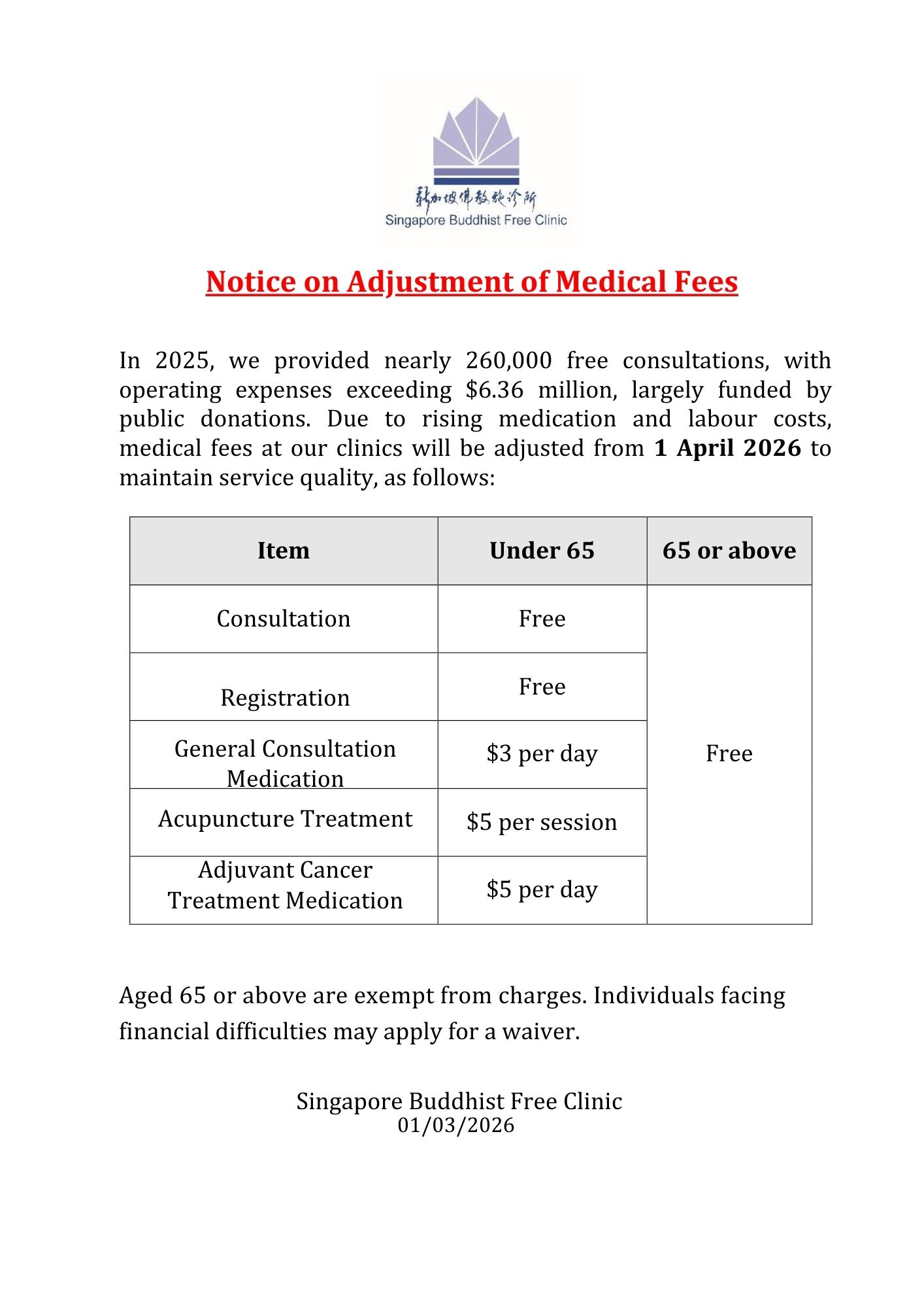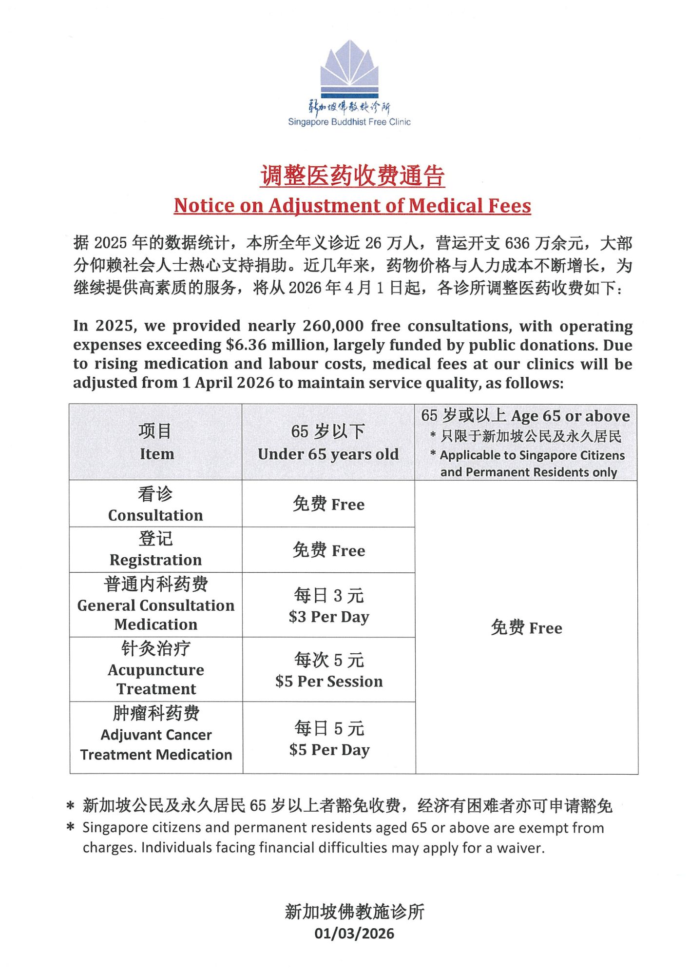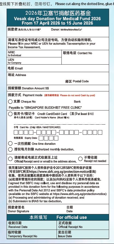 Singapore Buddhist Free Clinic is a charitable organisation set up by local Buddhists. Based on the Buddhist teachings of loving kindness and compassion, its objective is to provide free medical services to the sick and needy, so as to relieve their suffering on illness and to help them leading a healthier and happier life.